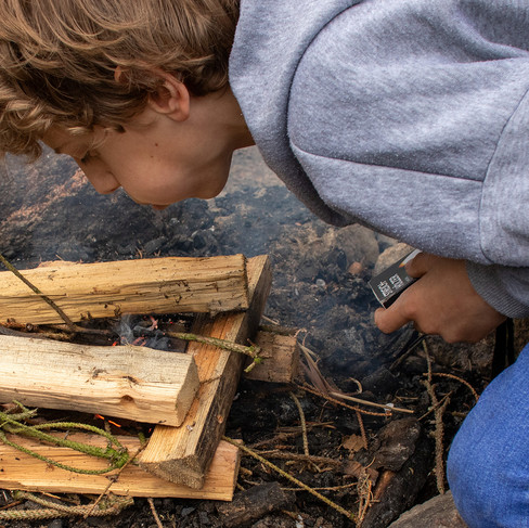 Hinweis: Nur mit Erlaubnis Feuer machen. Nie im Wald ein Feuer machen.